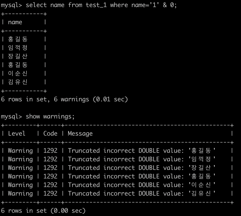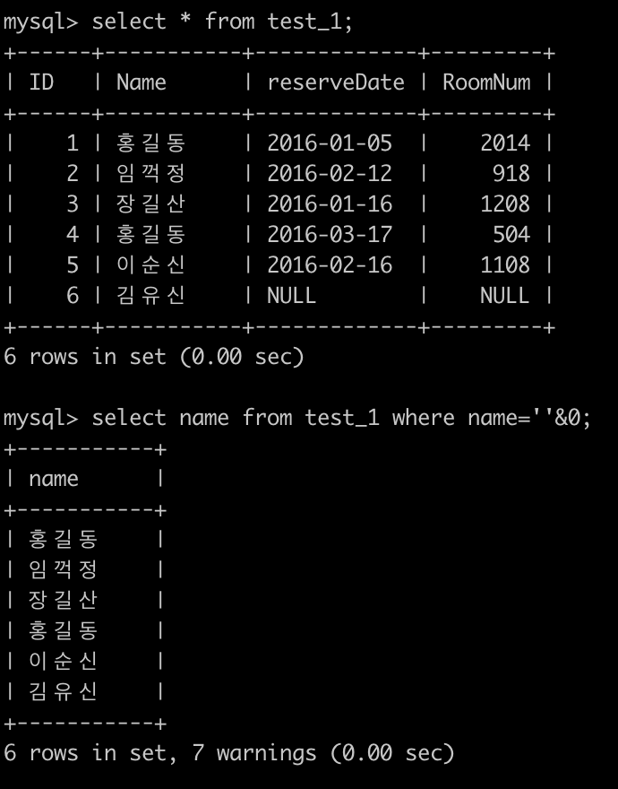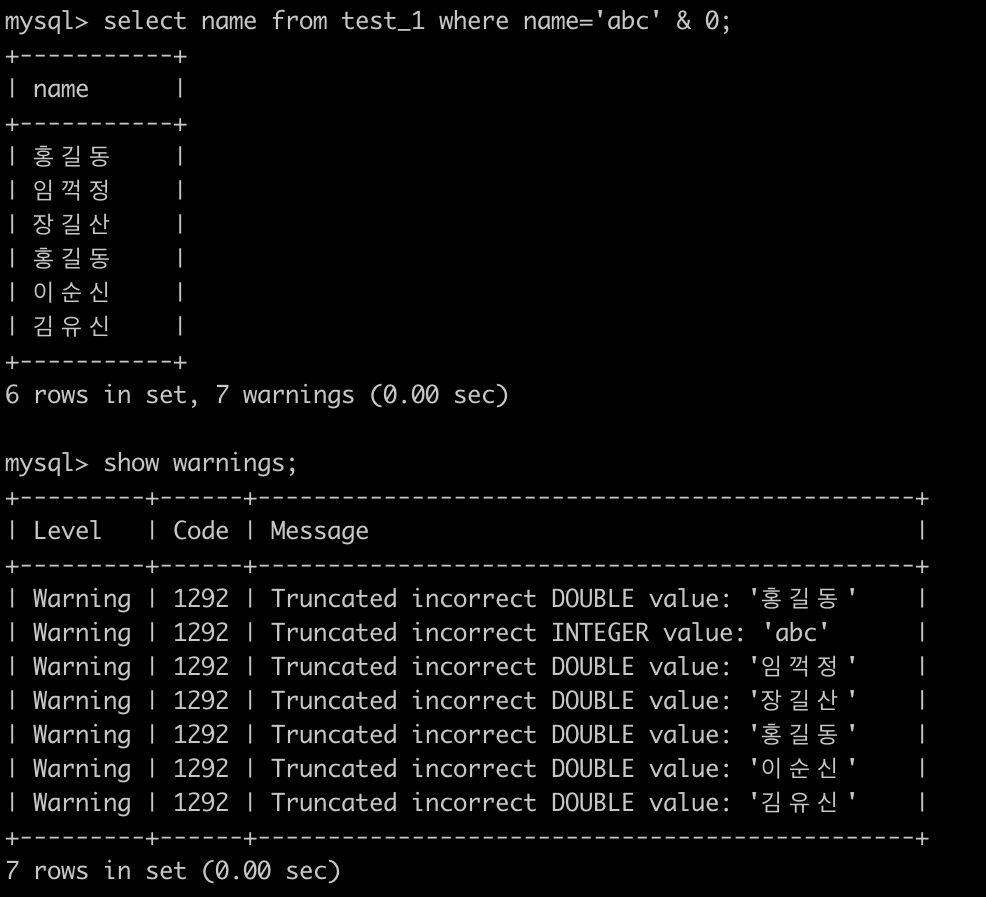test_1 테이블을 만들어서 조건을 바꿔가면서 넣어보았다.