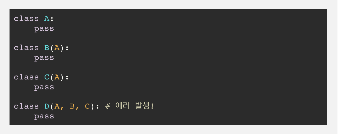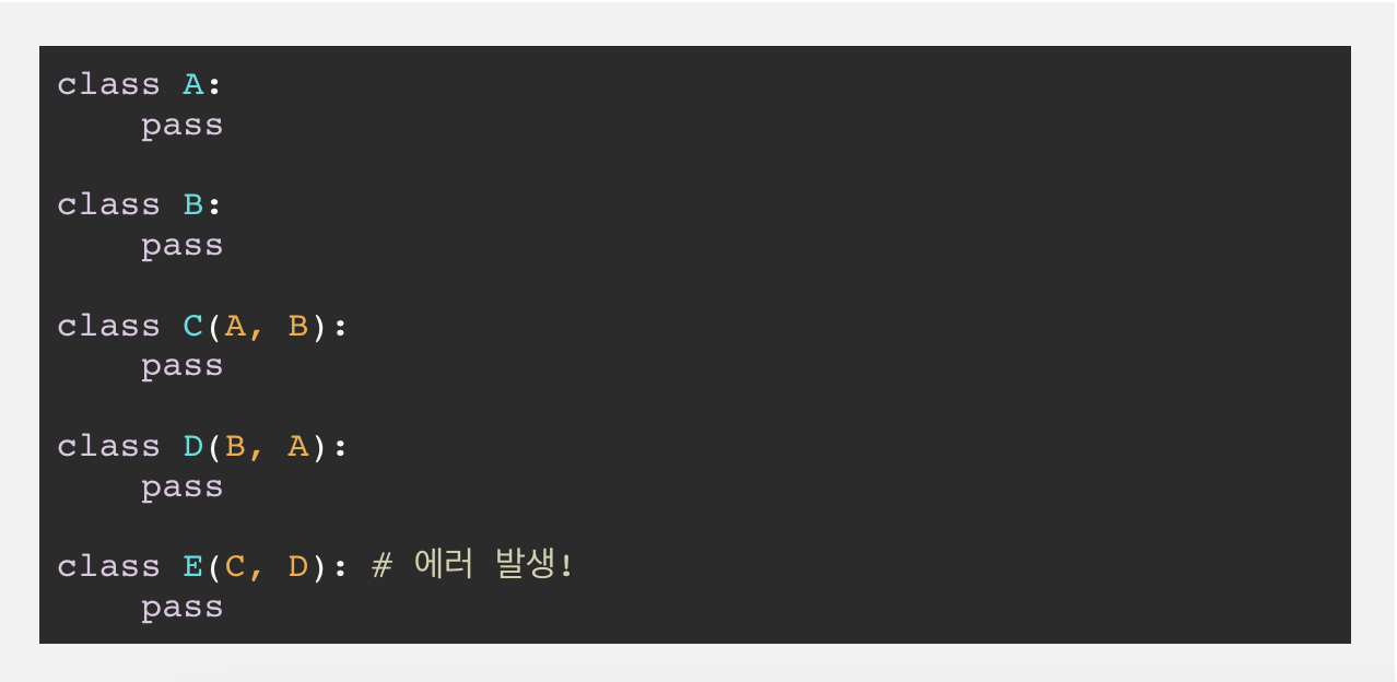 파이썬은 Cannot create consistent method ordering이라는 MRO 오류를 낸다.