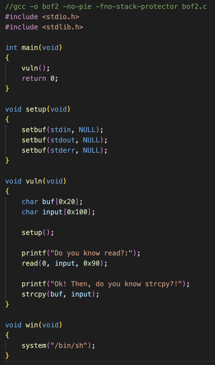 strcpy() 함수는 길이를 정해주지 않아서 BOF 취약점이 있습니다.