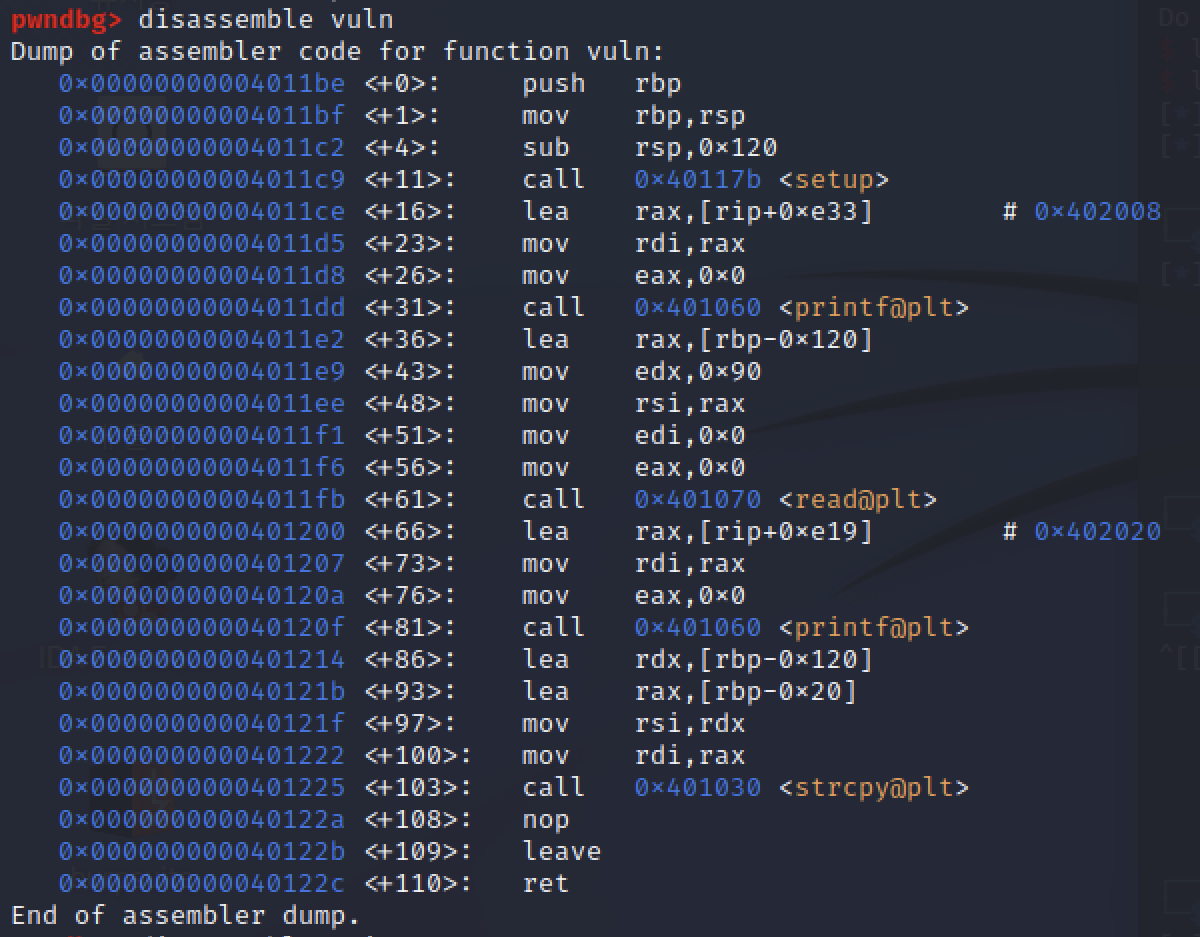 vuln() 함수를 디어셈블 해주면 buf의 주소로부터 rbp까지의 거리가 0x20임을 알 수 있습니다.
