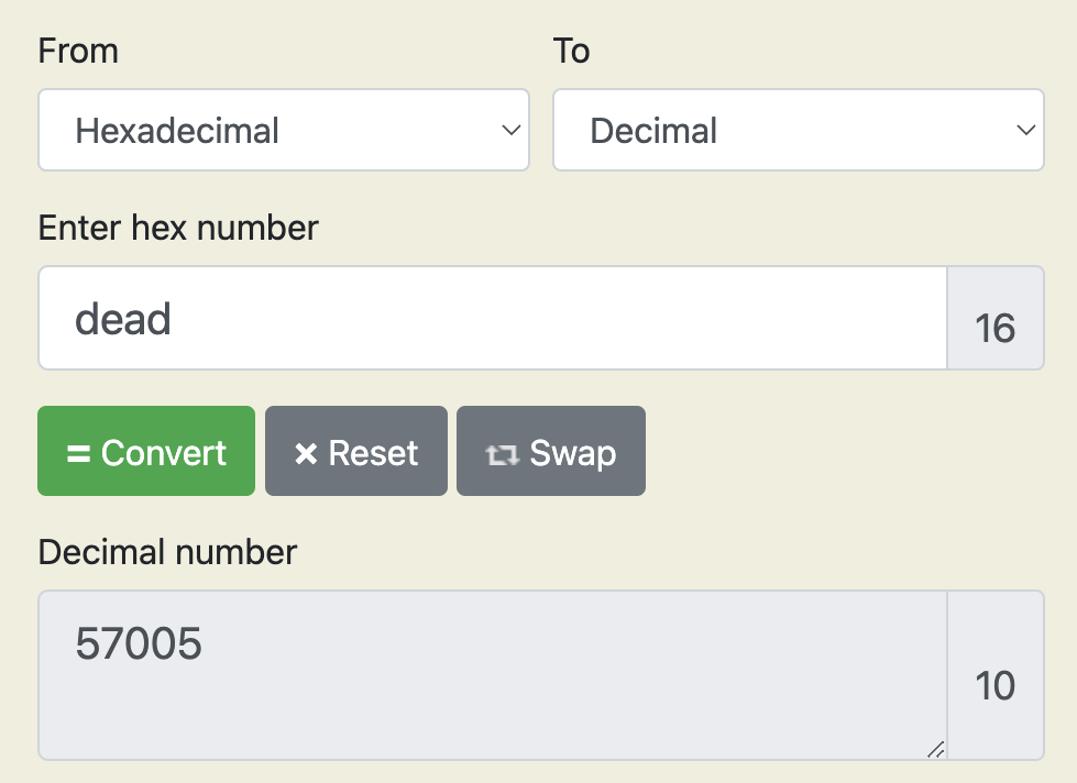 0xdead를 10진수로 바꾸면 57005입니다.