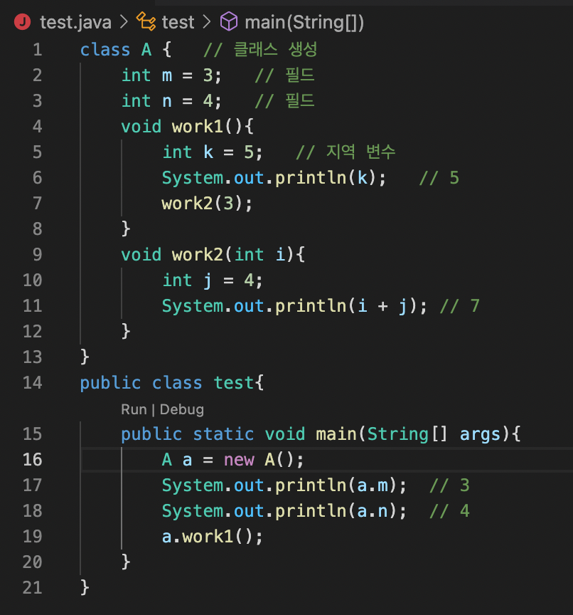 위 예제를 보면 클래스 A에는 필드 m, n과 메서드 work1(), work2()가 있다. 참고로 메서드는 '리턴타입 메서드명(){...}'의 형태를 가진다. work1() 메서드 안에서는 지역 변수 k를 선언하고, work2() 메서드 안에서는 지역 변수 i와 j를 선언했다. 매개 변수로 선언한 i도 work2() 메서드 안에 있는 지역 변수인 것이다. 그 다음에 클래스 A의 객체를 생성하면 참조 변수 a에 위치가 저장된다. 그리고 참조 변수와 포인트 연산자(.)를 이용해 필드 m과 n의 값을 출력했다. 마지막으로 work1() 메서드를 호출했다. work1() 메서드가 실행되고 안에 있는 work2() 메서드에 3이라는 값을 넘겨주면서(이 값은 i가 받는다) 호출한다.