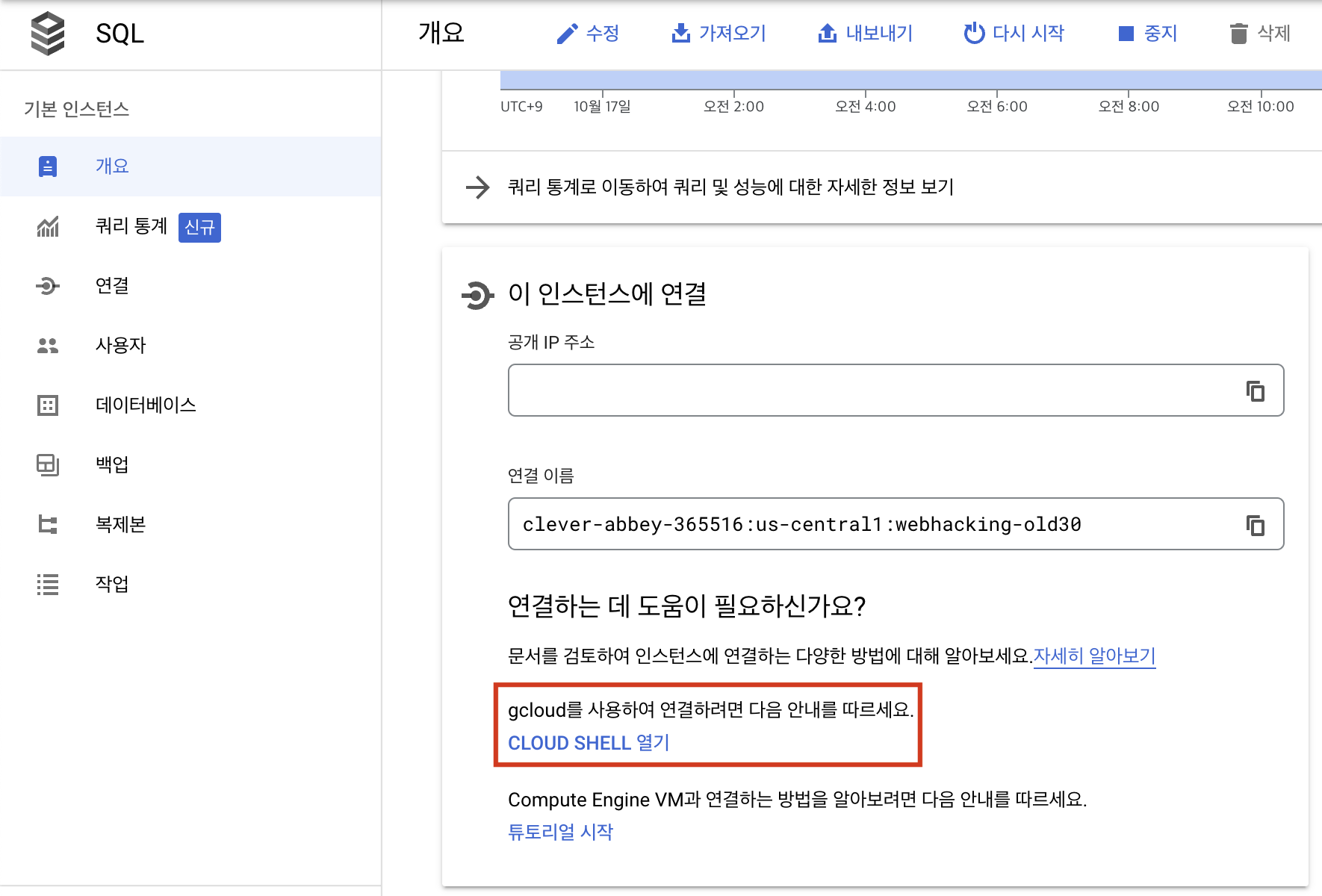 인스턴스를 하나 만들어주고 클라우드 셸에서 소스 코드에 적힌대로 db와 table을 작성해줍니다.