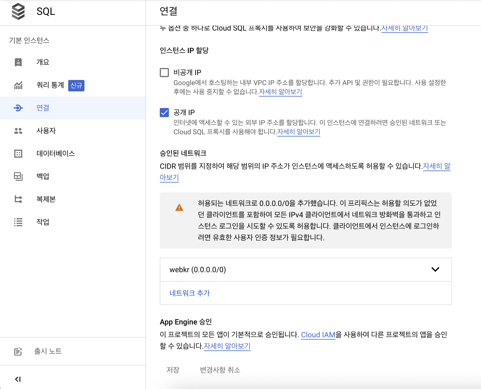 host에는 구글 클라우드에서 부여해준 mysql의 외부 아이피를 넣으면 됩니다.