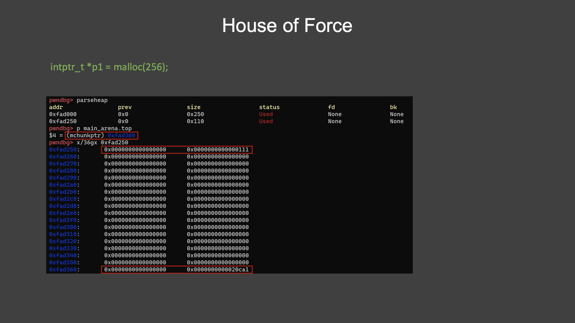malloc으로 요청한 청크는 0xfad250에 할당되었으며 탑 청크는  0xfad360에 위치한다.