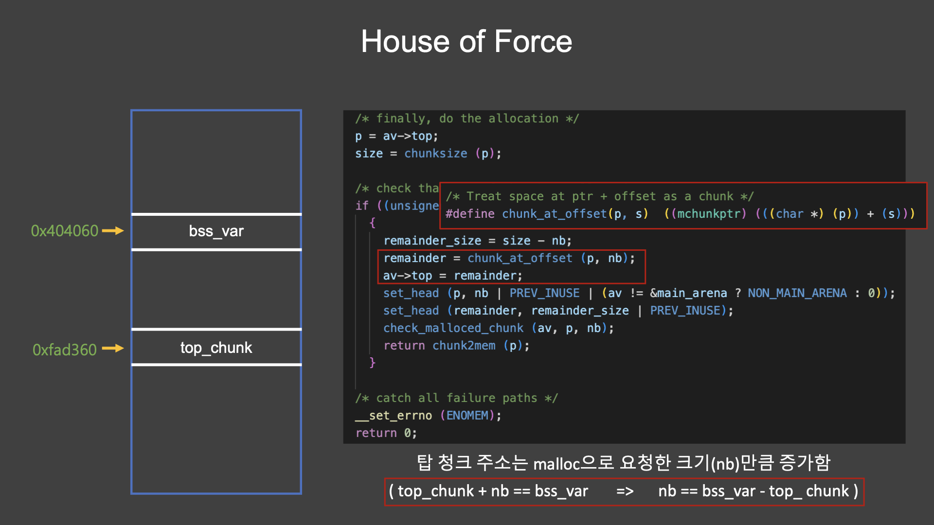 정리하면 타겟 주소에서 탑 청크 주소를 빼준 뒤 헤더를 2번 빼주면 된다.