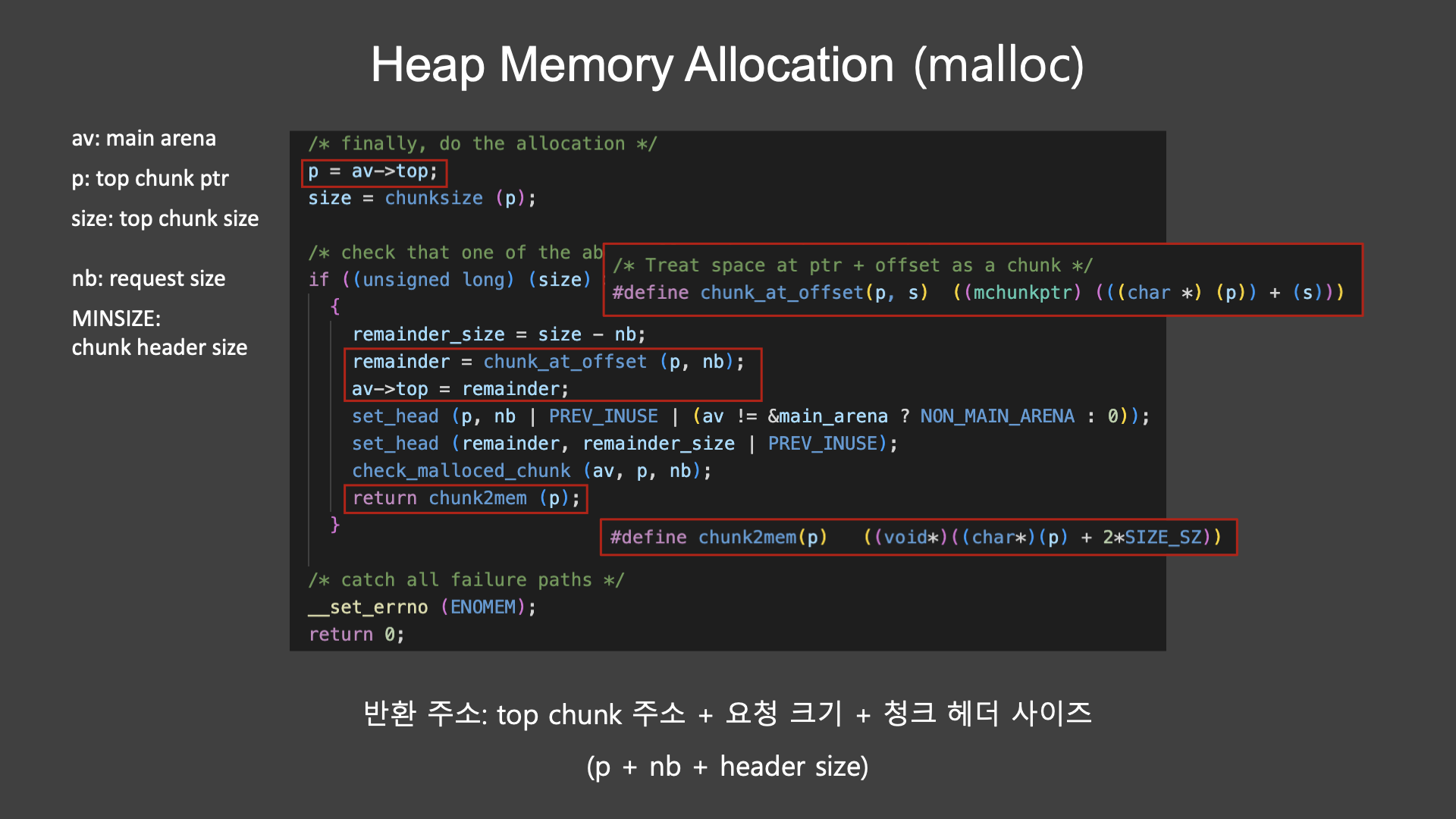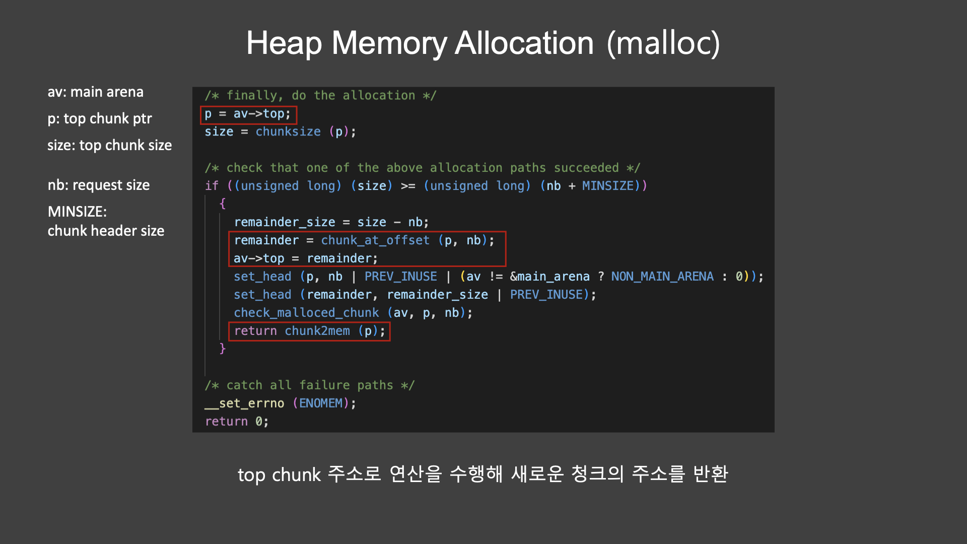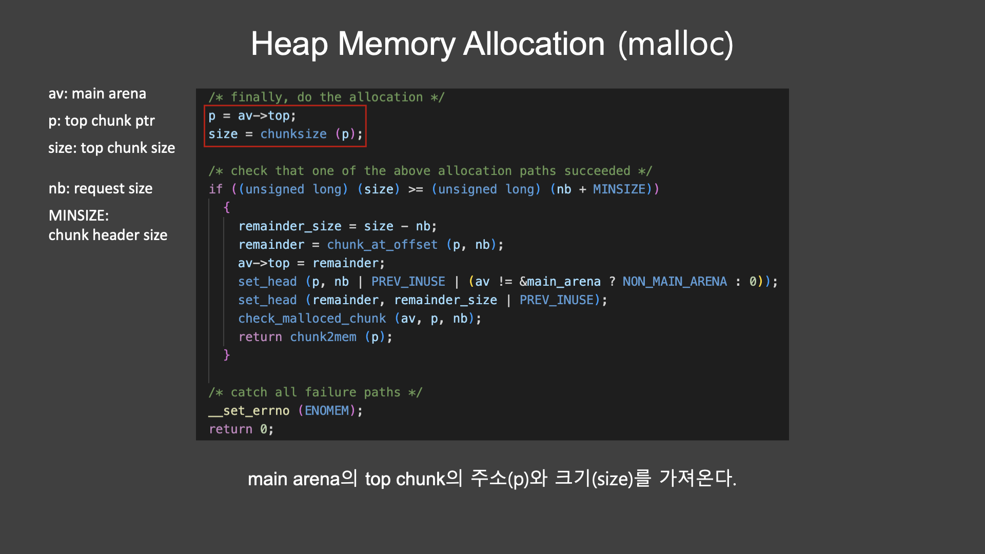 av는 main arena를 의미하고, p는 탑 청크 주소, size는 탑 청크의 헤더를 포함한 사이즈이다.