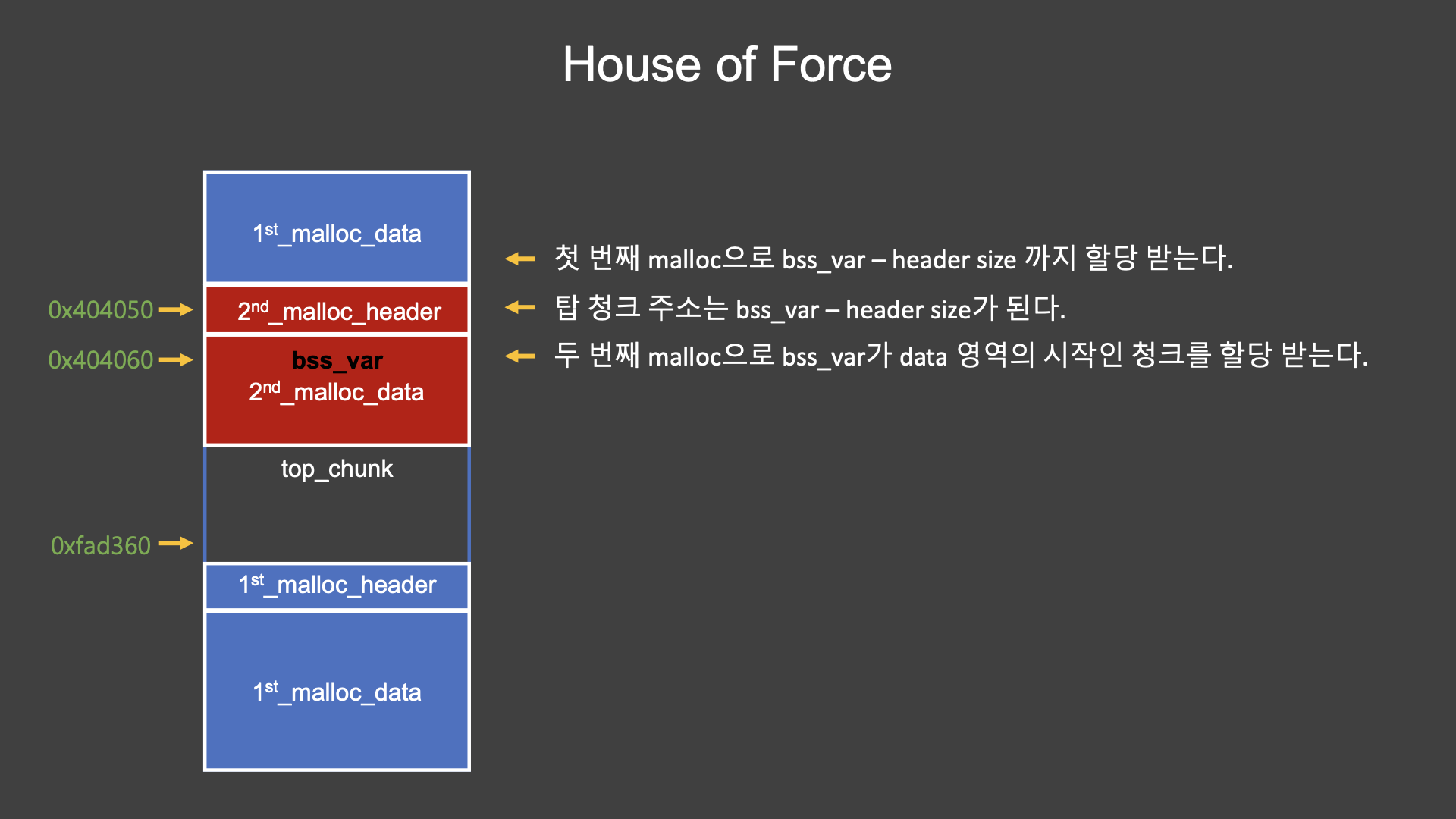 두 번째 malloc의 반환 값인 데이터가 시작되는 주소는 정확히 bss_var의 주소인 0x404060이 된다.
