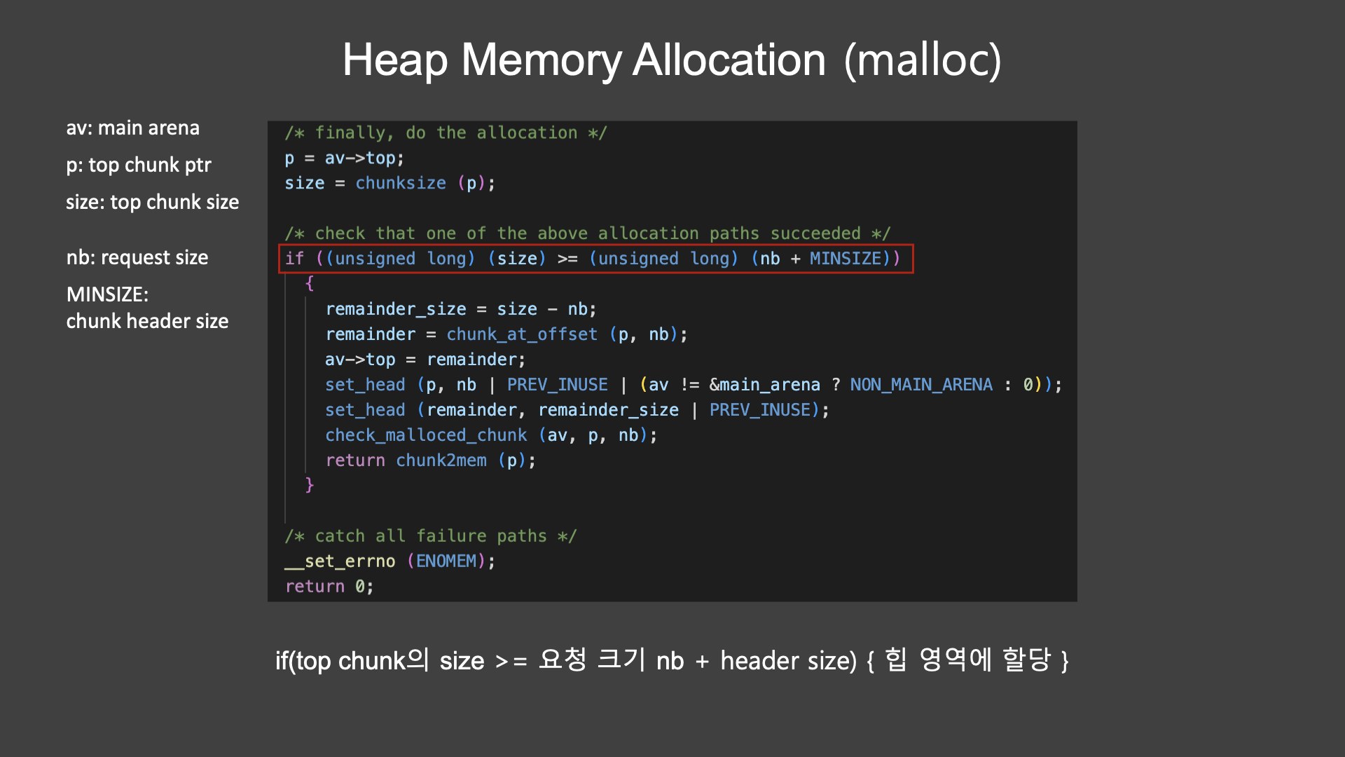 if 문을 보면 탑 청크의 가용 사이즈가 malloc으로 요청한 크기인 nb에 청크 헤더를 더한 크기보다 크거나 같으면