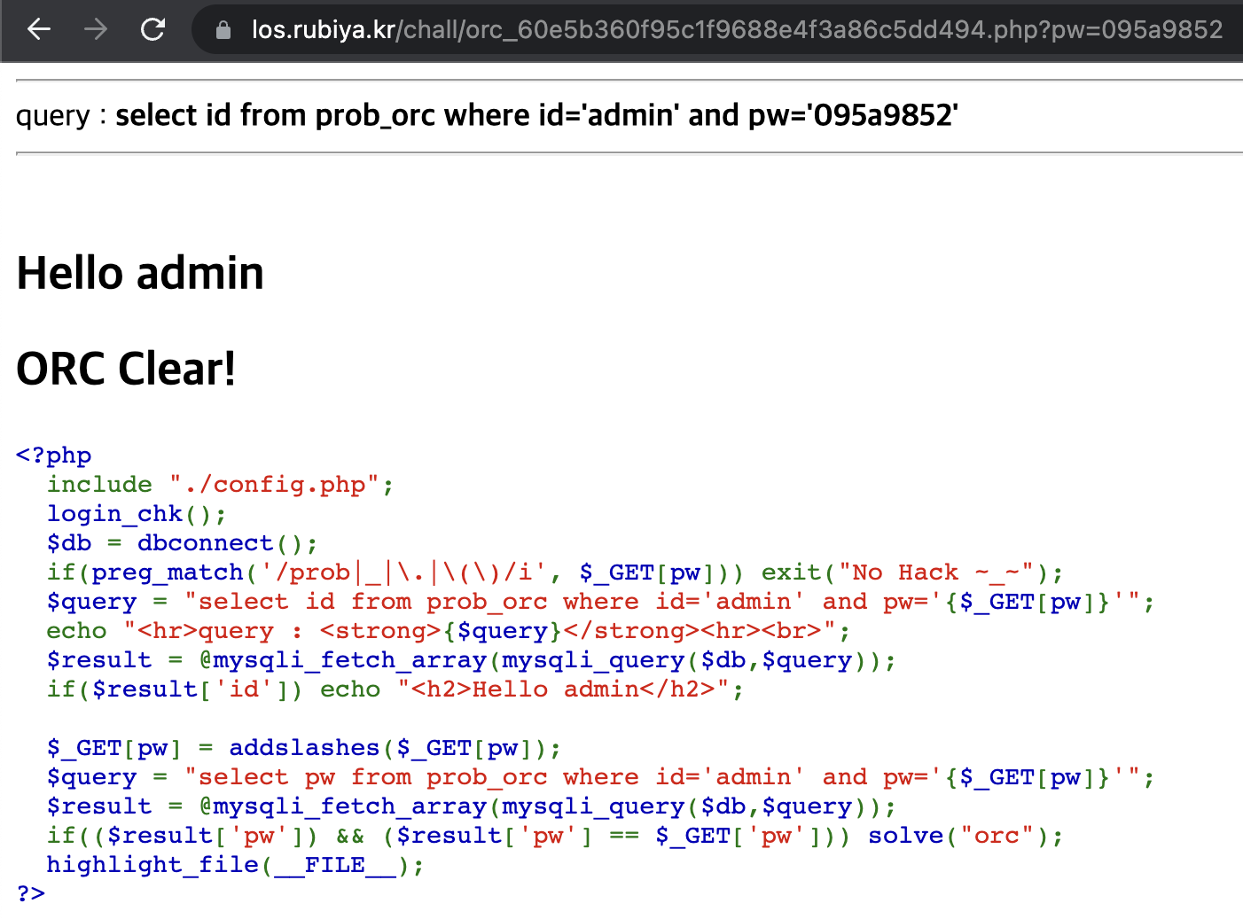 두 번째로 쿼리의 결과 값이 존재하면서 pw가 실제 데이터베이스의 pw값이랑 일치할 때 문제가 풀립니다.