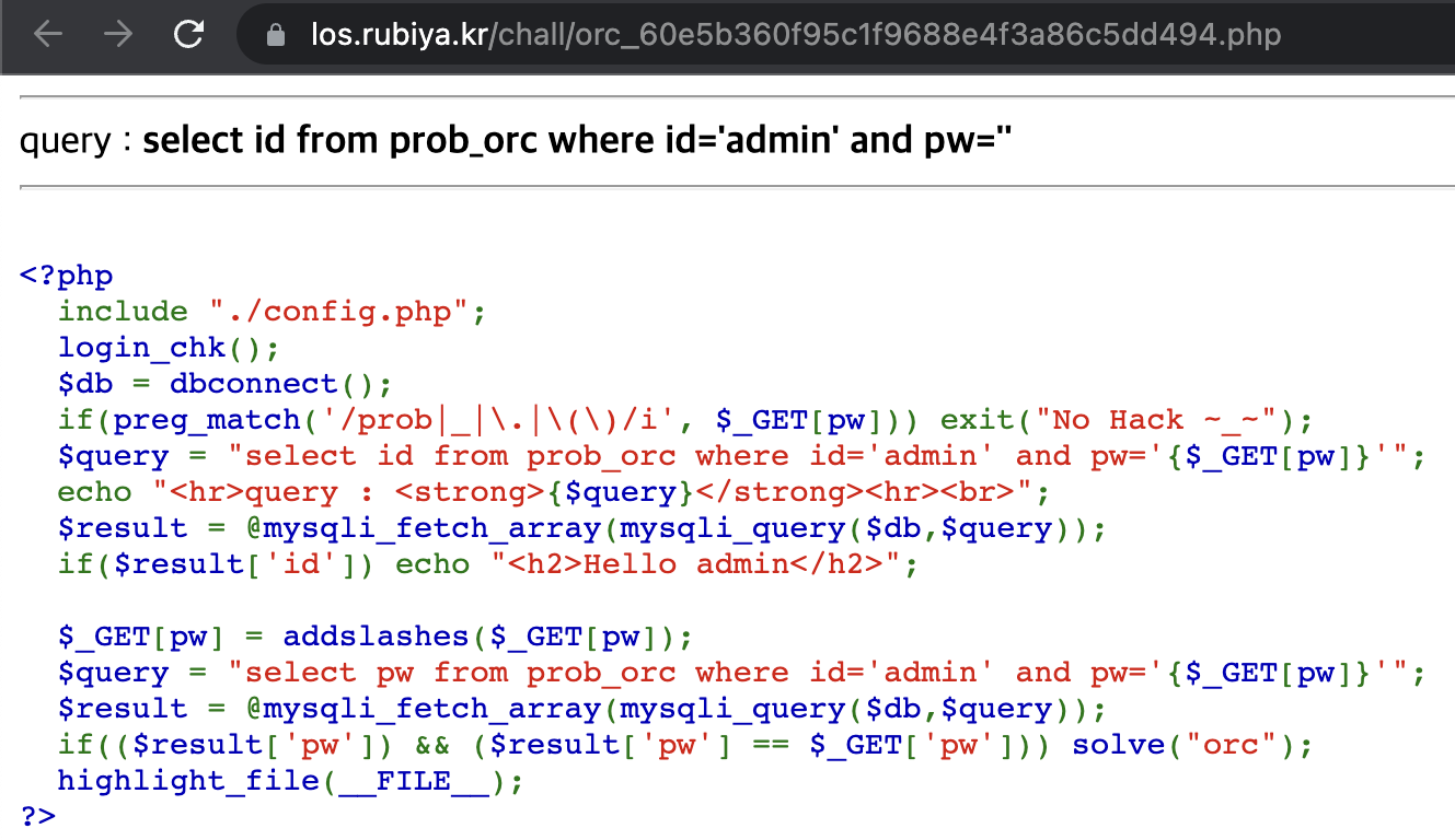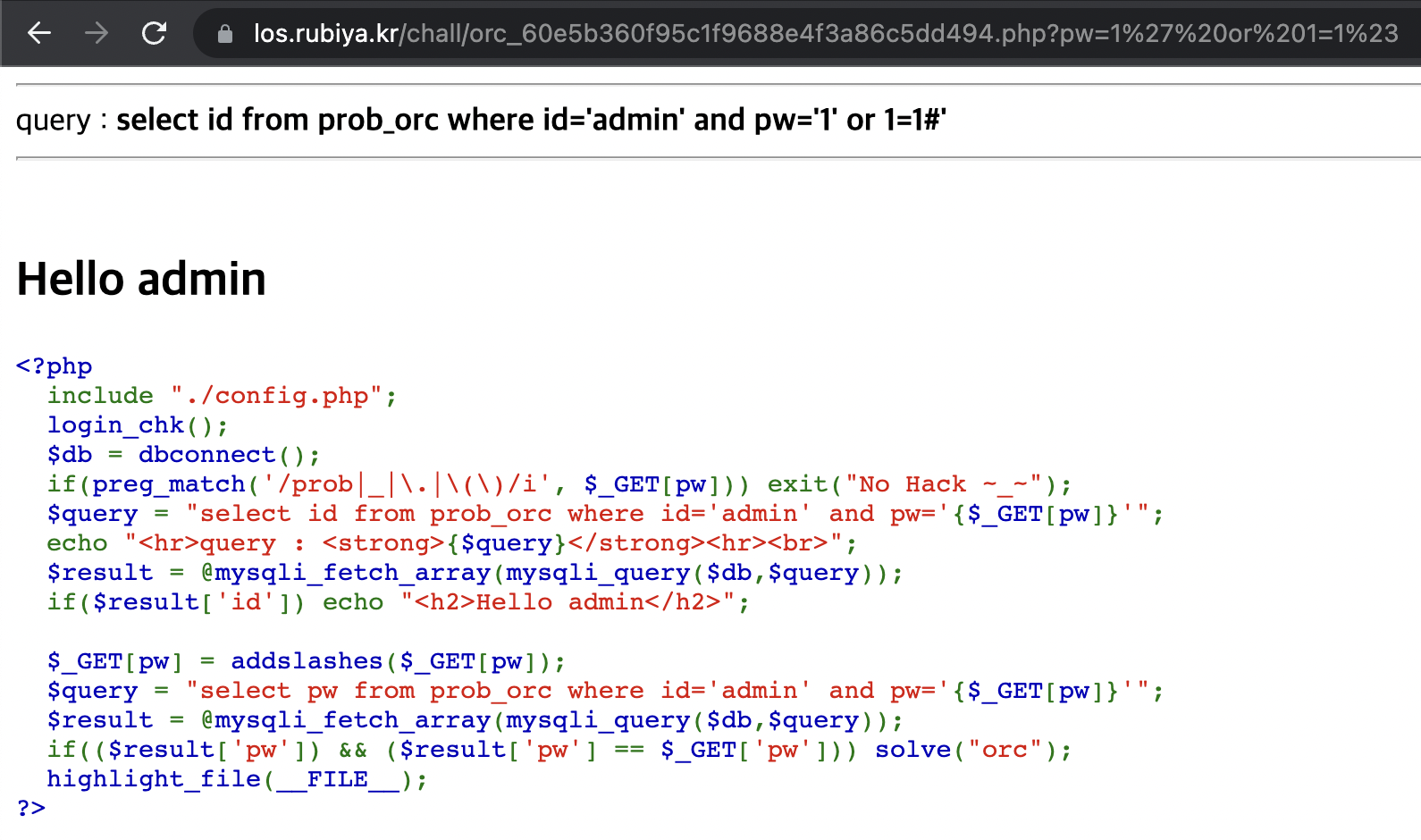 만약 id 값이 존재하면(쿼리의 결과가 참이면) Hello admin이 출력됩니다.