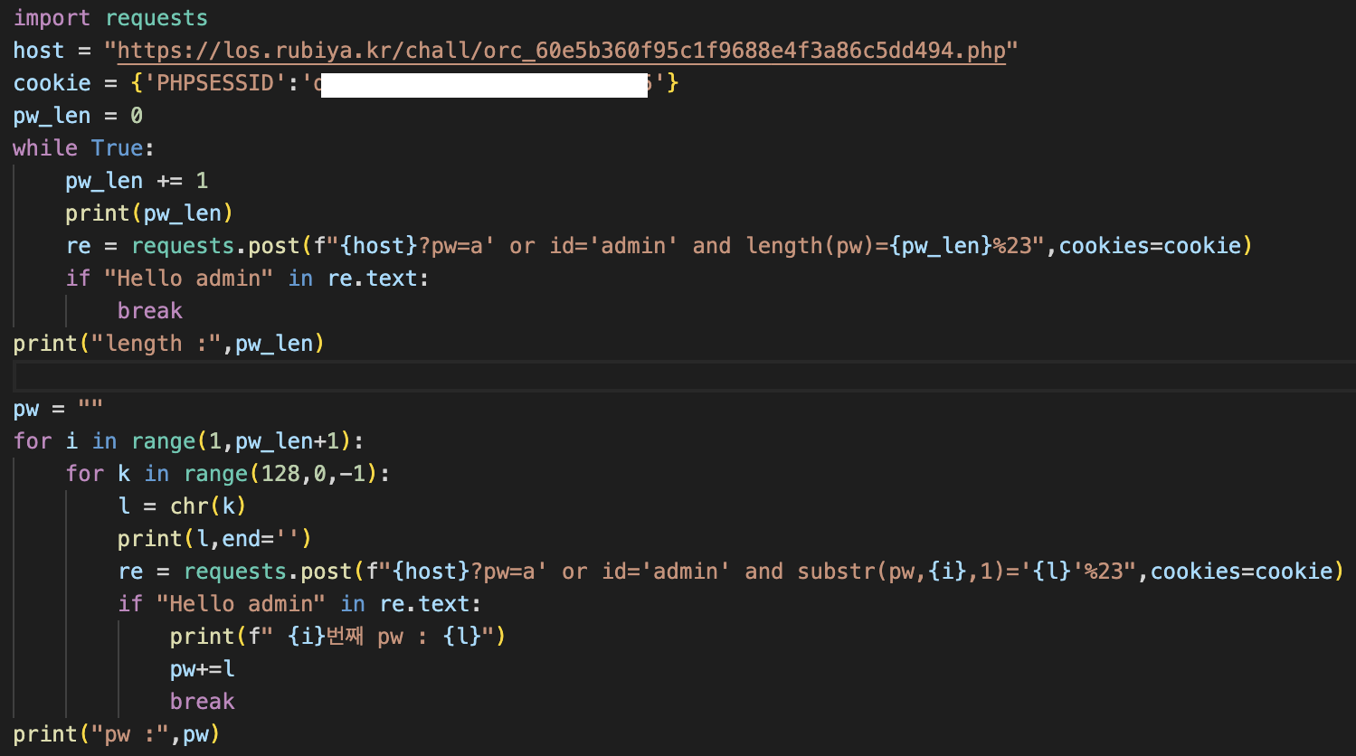 만약 id를 'admin'으로 지정해주지 않으면 다른 계정의 pw를 검색하게 됩니다.