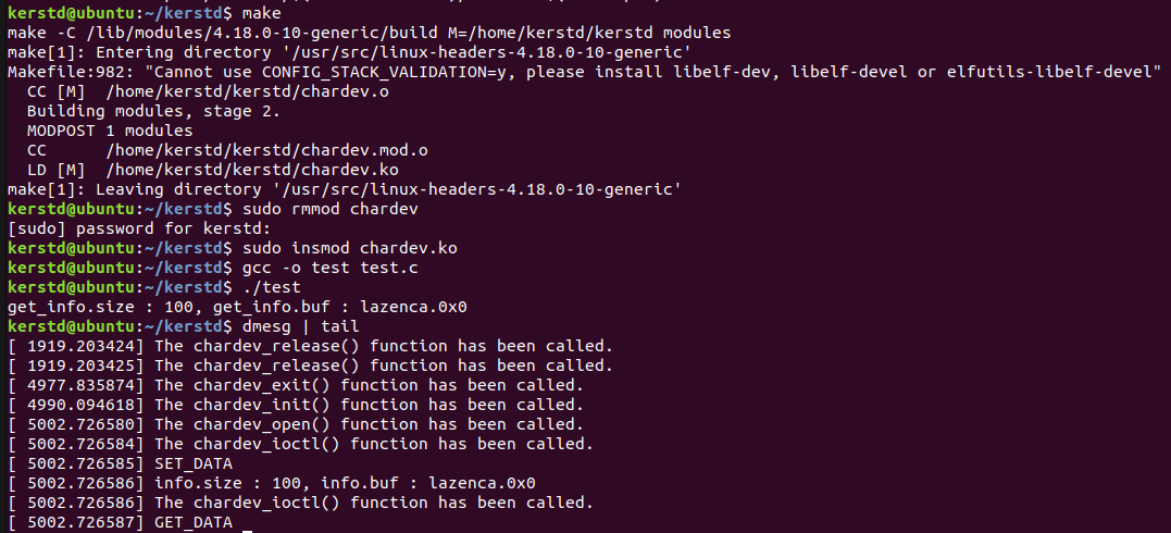 - cmd의 값이 "GET_DATA" 일 경우 copy_to_user() 함수를 이용하여 Kernel 영역에 저장된 info 구조체 변수 데이터를 사용자 공간으로 복사한다.