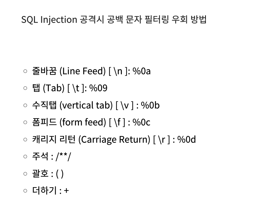 SQL Injection 공격시 공백 문자 필터링 우회 방법 줄바꿈 (Line Feed) [ \n ]: %0a 탭 (Tab) [ \t ]: %09 수직탭 (vertical tab) [ \v ] : %0b 폼피드 (form feed) [ \f ] : %0c 캐리지 리턴 (Carriage Return) [..