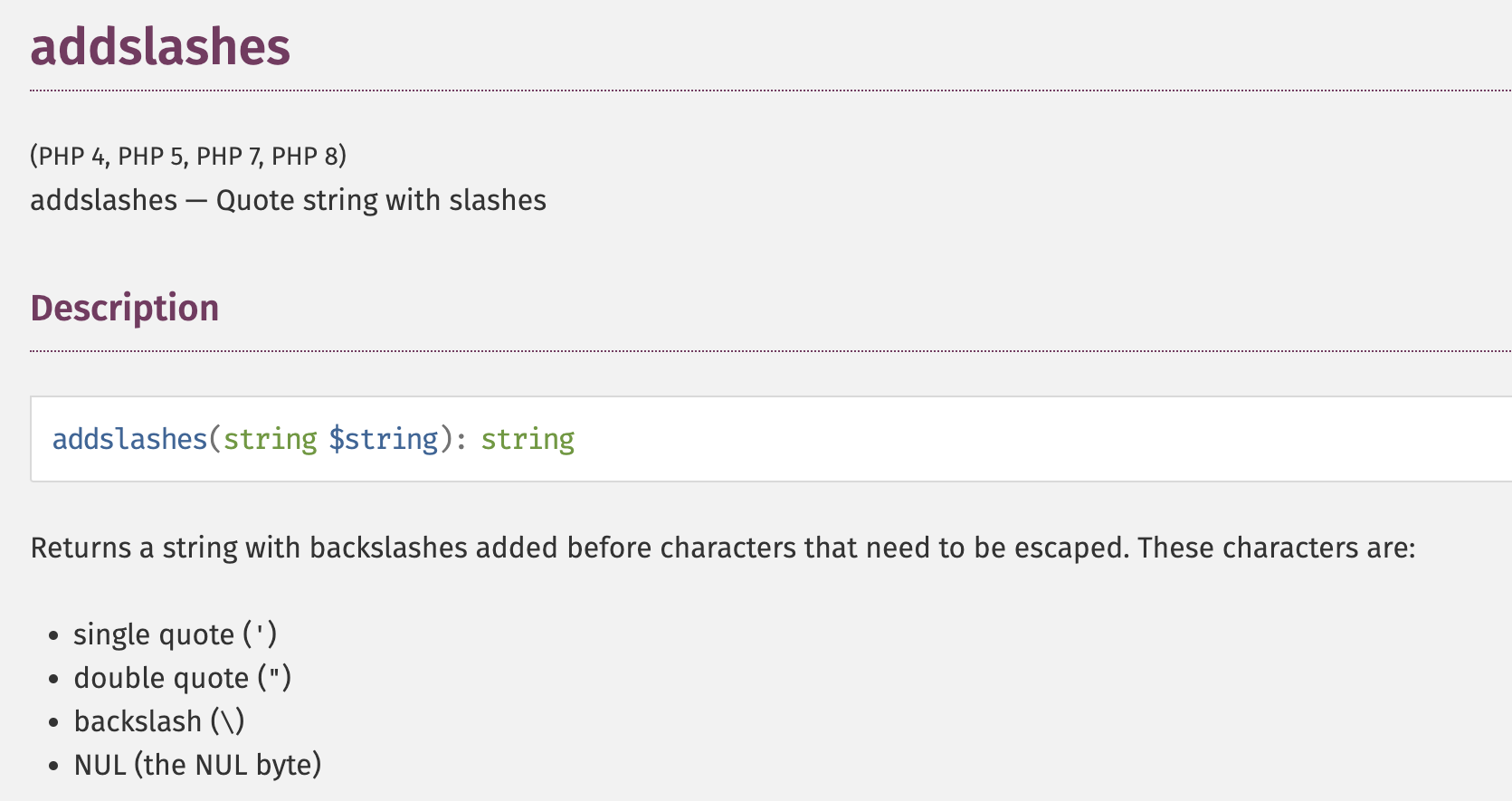 addslashes 함수는 ', ", \, nul byte에 \ 문자를 추가해 일반 문자로 만들어줍니다.